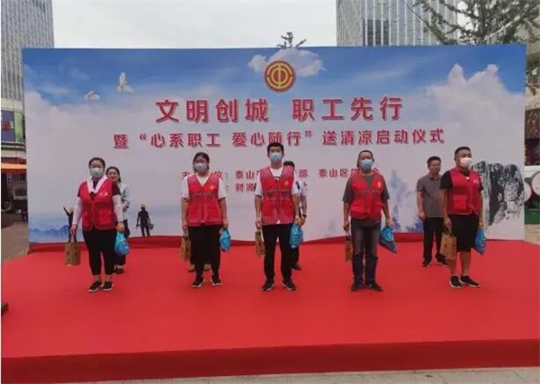 为全面深化我区全国文明城市创建工作,进一步提升全区整体文明程度,提高创建水平,巩固创建成果,8月7日,泰山区“文明创城职工先行”主题活动暨“心系职工 爱心随行”送清凉启动仪式在泰安万达广场举行。